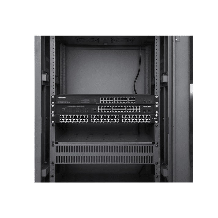 The Intellinet 716246 Pro Line Network Cabinet with Integrated Fans (38U) is a heavy‑duty, floor‑standing rack enclosure designed for professional network, server, telecommunications, and A/V equipment. This cabinet ships fully assembled for quick deployment and is finished in a sleek black (RAL 9004) powder coat. Its robust construction and integrated features make it ideal for demanding installations.