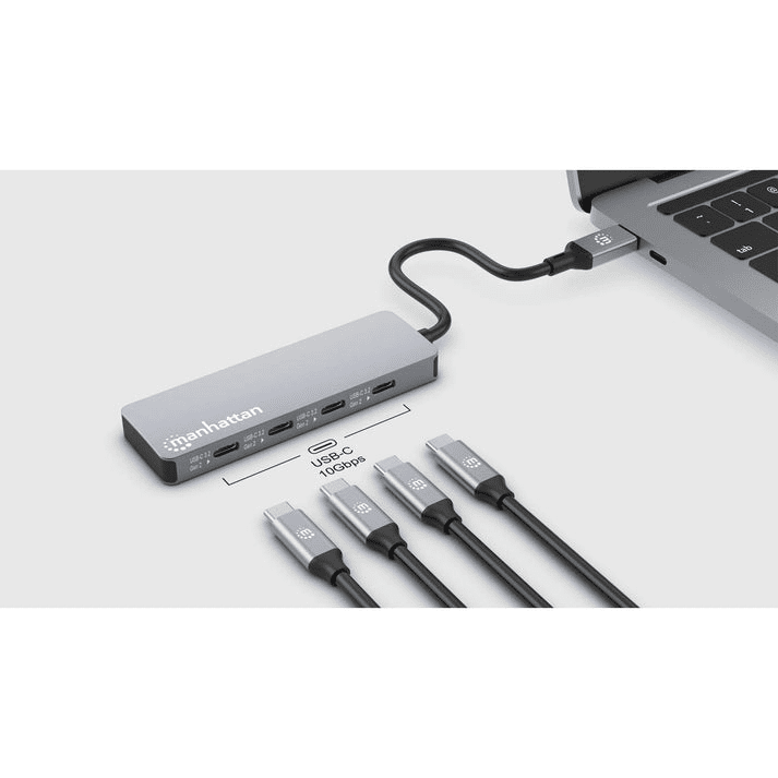 Manhattan 181143 4-Port 10G USB-C Hub – USB-C Male to 4 USB-C Ports, SuperSpeed+ 10Gbps, Bus-Powered, Aluminum, Space Gray