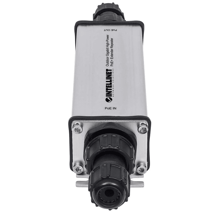 The Intellinet IPE-ODG extender repeater amplifies and regenerates an IEEE 802.3at/af PoE signal, extending your PoE+ network by up to 100 meters over standard Cat5e/6 cable without any external power source. Designed for harsh outdoor environments, it features an IP65-rated metal housing and operates reliably from –40 °C to 75 °C, making it ideal for long-range connections to cameras, wireless access points, and other remote devices.