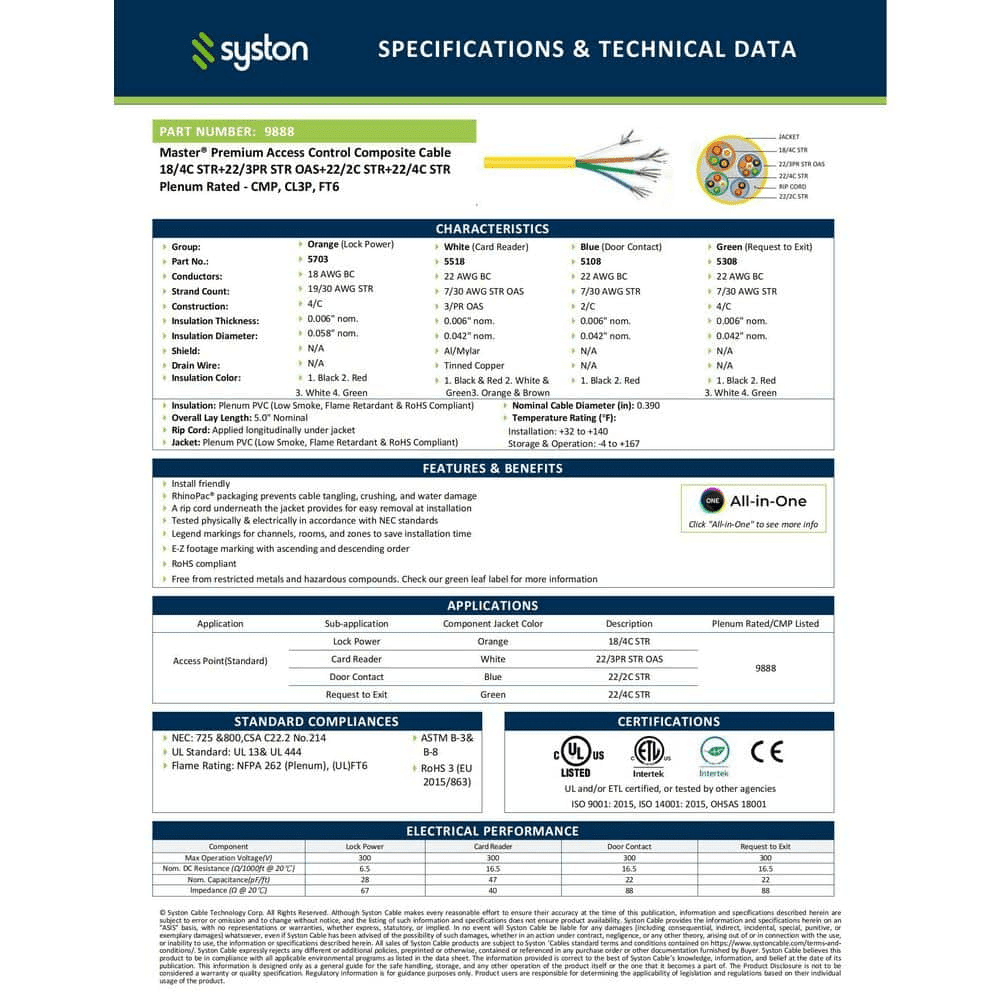 The Syston 9888-SP-YL-500 Access Control Composite Cable is engineered to streamline access control installations by combining multiple control and signal cables into a single, plenum-rated assembly. This 500-foot yellow cable integrates four distinct conductor sets, each tailored for specific access control functions, ensuring efficient and organized installations in commercial and institutional environments.