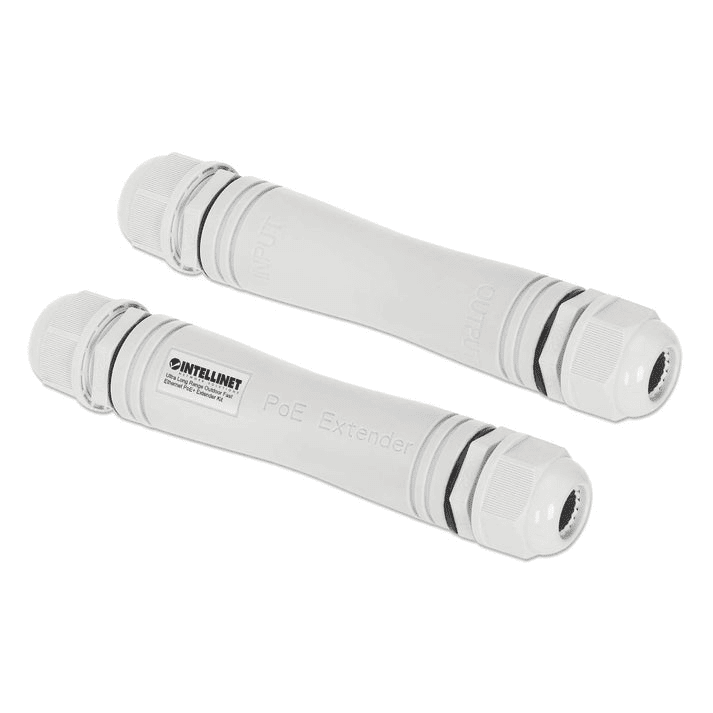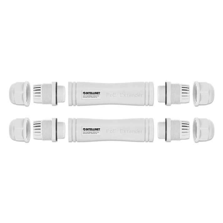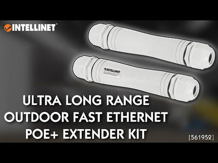The Intellinet 561952 is a high-performance outdoor PoE extension kit designed to dramatically expand the reach of PoE links—up to 1,000 m (3,280 ft)—while maintaining data connectivity and delivering power to downstream devices.